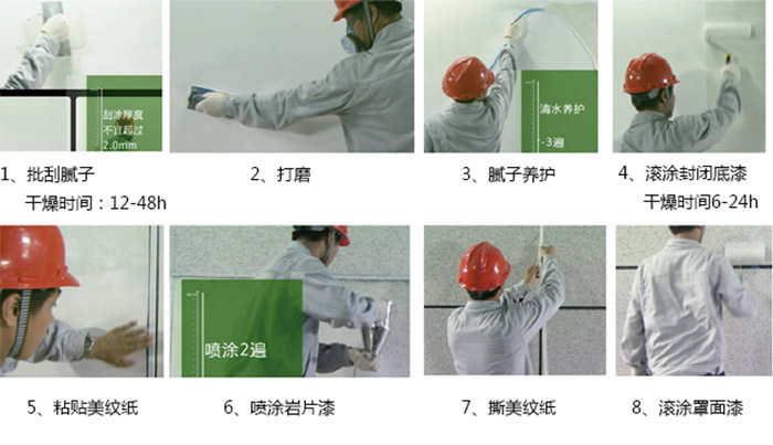 ●在同一面墙上保持设备气压、施工手法、施工厚度等一致,防止造成开裂、透底、色差、发花等弊病